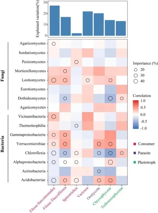 ▲Figure 5. The associations between the relative abundance of core functional protist taxa and main bacterial and fungal taxa estimated by Spearman’s correlations and random forest modelling.4. 研究的局限性