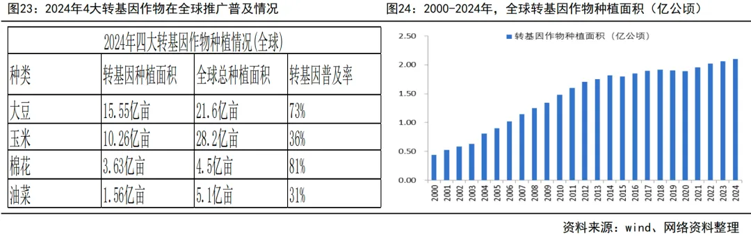 全球:美国1996年推广转基因大豆标志着转基因技术产业化的开始。2000-2024年,转基因作物种植面积从0.44亿公顷增至2.09亿公顷,年均复合增速6.7%;2024年,全球转基因作物种植面积为2.098亿公顷,占到耕地总面积(15亿公顷)约13%。2024年,转基因作物种植覆盖了27个国家,其中北美和南美是全球转基因