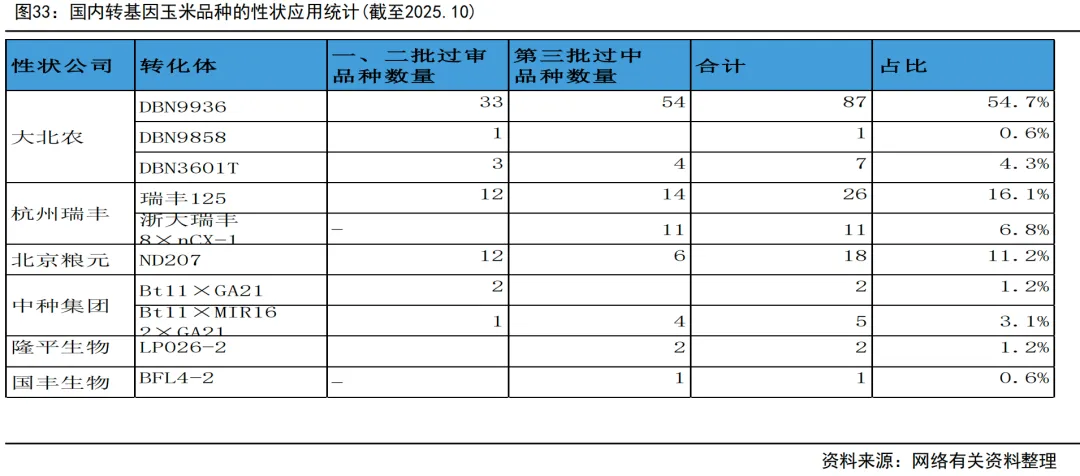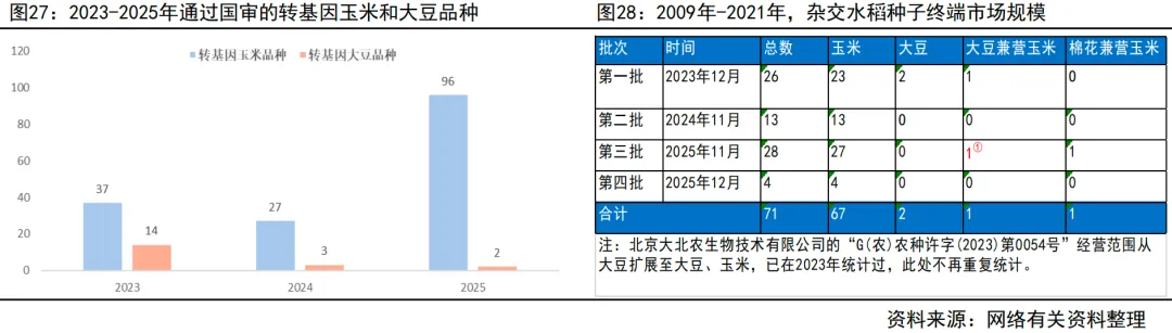 转基因品种审定数量自2023年以来迎来爆发式增长:2022年6月8日国家农作物品种审定委员会发布关于印发国家级转基因大豆玉米品种审定标准的通知,这意味着我国转基因大豆及玉米品种的审定工作将正式开始;截至2025年底,全国累计审定转基因玉米品种160个、大豆品种19个,品种库极大丰富。其中,2025年审定通过96个转基因玉米品种和2个转基因大豆品种,远超2023-2024年合计通过的64个玉米和17个大豆品种,释放出加速产业化的明确信号。据有关统计,2025年,农业农村部新增发放主粮类转基因种子生产经营许可证(G证)34项,截至年底全国累计发放71项,覆盖99个品种,其中玉米品种占绝对主导。