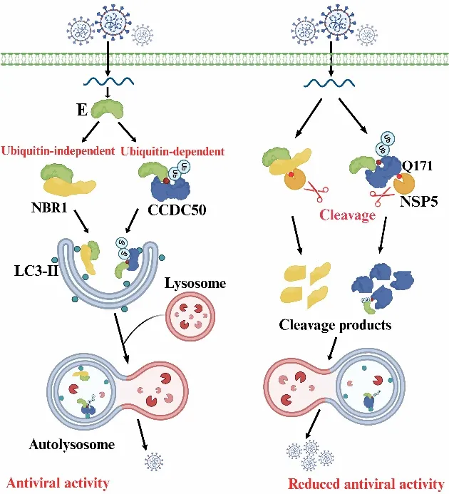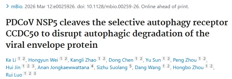 今天给大家分享一篇2026年3月华中农业大学动物科学技术学院、动物医学院罗锐教授团队在学术期刊《mBio》上发表的一篇题为“PDCoV NSP5 cleaves the selective autophagy receptor CCDC50 to disrupt autophagic degradation of the viral envelope protein”的研究性论文,该研究在团队前期揭示猪δ冠状病毒(PDCoV)通过切割选择性自噬受体NBR1实现免疫逃逸机制的基础上(Li et., Autophagy, 2025),进一步解析了冠状病毒逃逸宿主选择性自噬防御的新机制。