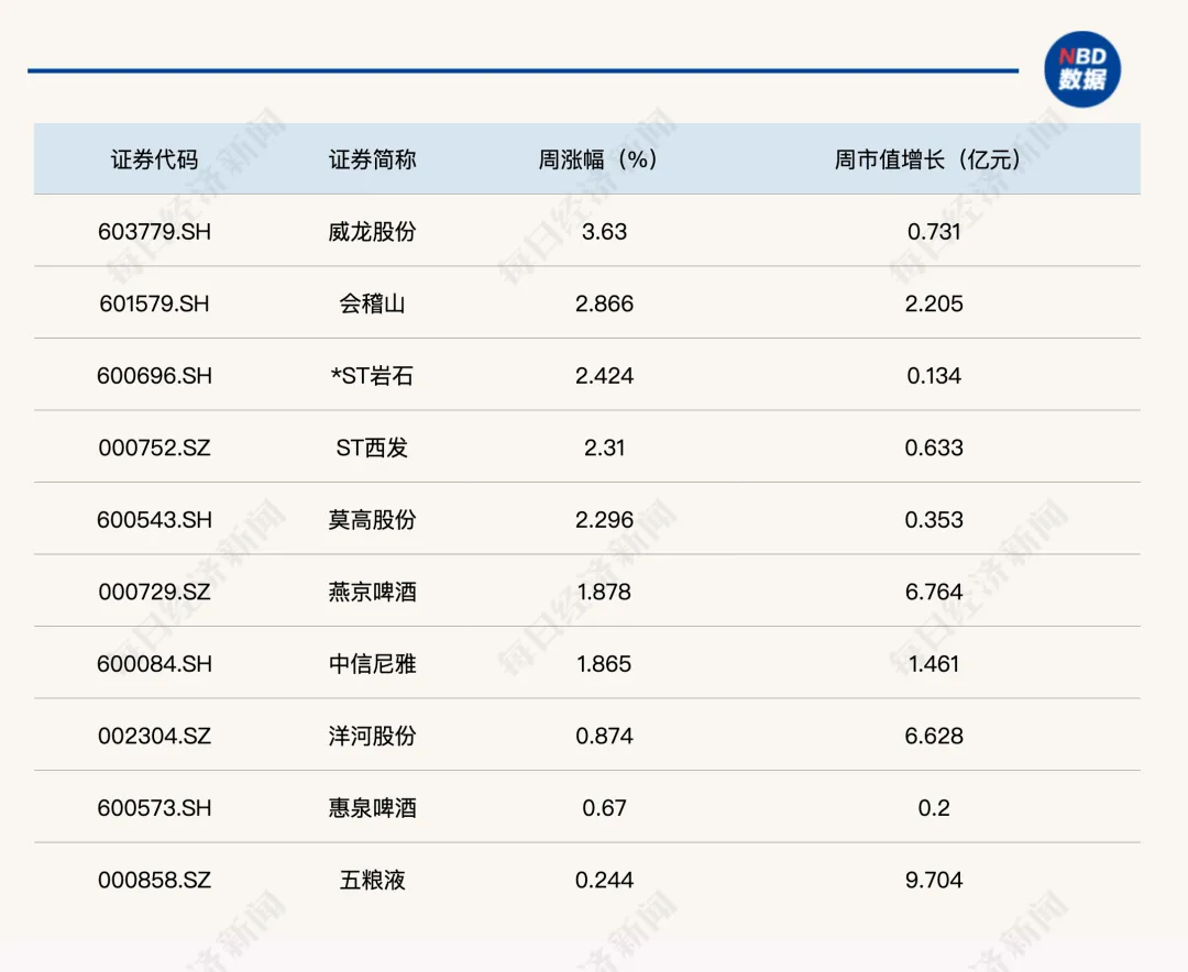 非白酒板块方面,啤酒股整体抗跌,燕京啤酒、ST西发以及惠泉啤酒本周实现小幅上涨,青岛啤酒、华润啤酒、重庆啤酒以及珠江啤酒周跌幅则在1%以内。