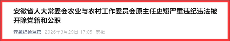 2026年3月29日,据安徽纪检监察网微信公众号“安徽纪检监察”消息: