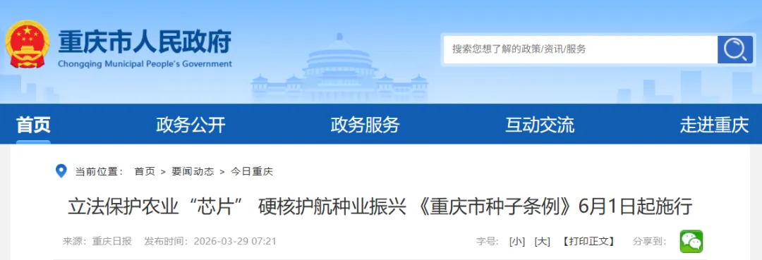 种子,承载着粮食安全的根基,也孕育着乡村振兴的希望。3月25日,市六届人大常委会第二十二次会议表决通过《重庆市种子条例》(以下简称《条例》),自2026年6月1日起施行。