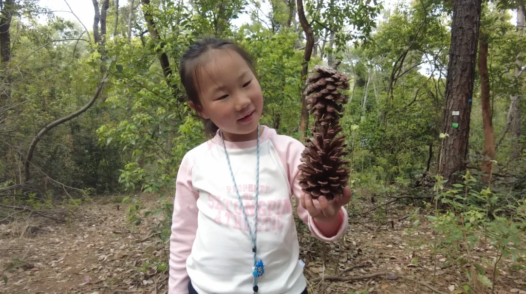 在今天的踩线过程中,我们看到了两组家庭,大人带着孩子匆匆路过,小朋友对超大的松果满是好奇,非常渴望去探索,大人却在自顾自的聊天,并没有充分利用儿童对自然天然的好奇,去引导他们思考更深的问题、更有趣的玩法。