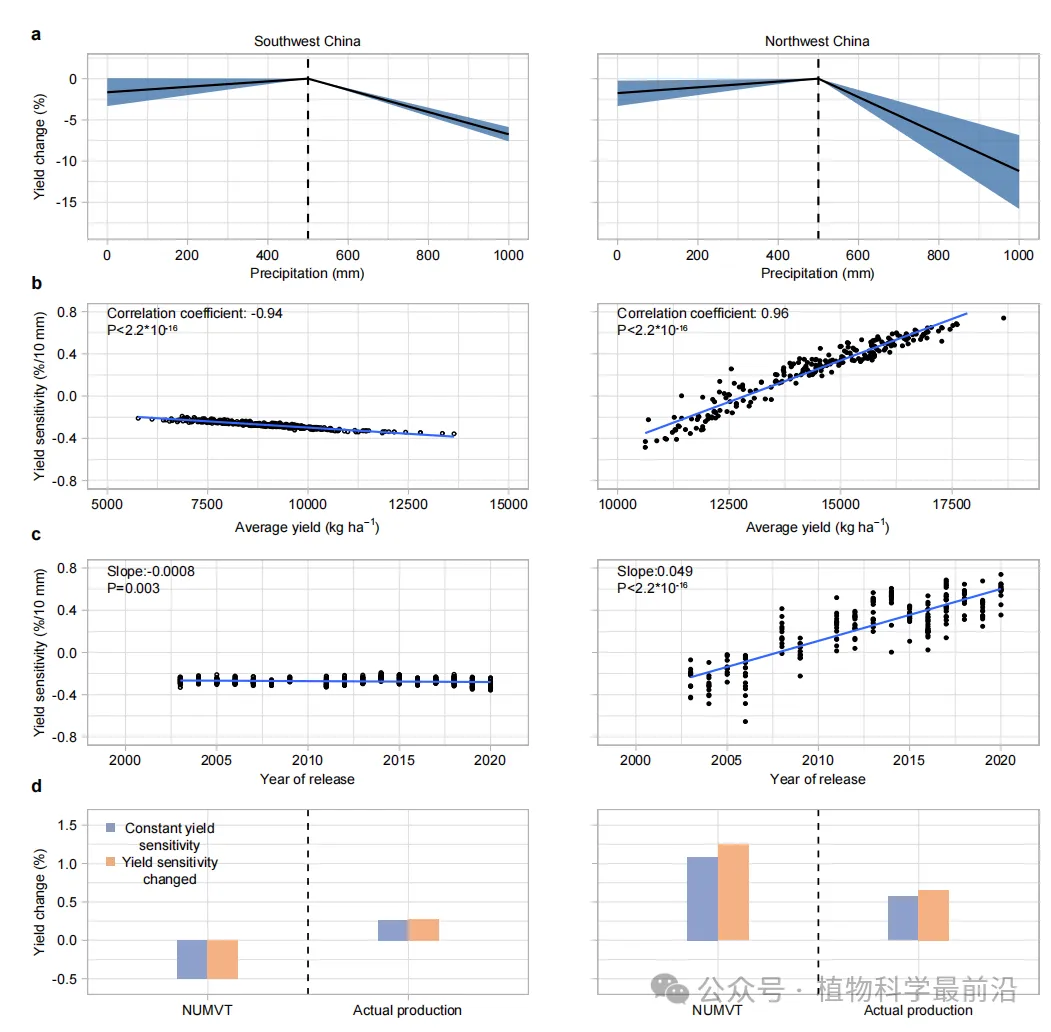 东北地区的高产品种受高温胁迫危害最重,且高温敏感性呈增加趋势,未来受高温胁迫影响产量损失可能进一步加剧,华北地区玉米高温胁迫敏感性随时间整体下降,表明品种更新在提高玉米高温韧性中发挥了重要作用,实际生产数据评估结果反映了同样的趋势(图4)。生育期内降水<500mm时降增加有助于玉米增产,降水不足导致减产,>500mm时,降水过多会导致玉米单产降低。西南地区和西北地区分别因降水过多和不足导致玉米减产。随着品种更新,西南地区和西北地区玉米对降水的敏感性均有所上升,高产品种尤为明显(图5)。