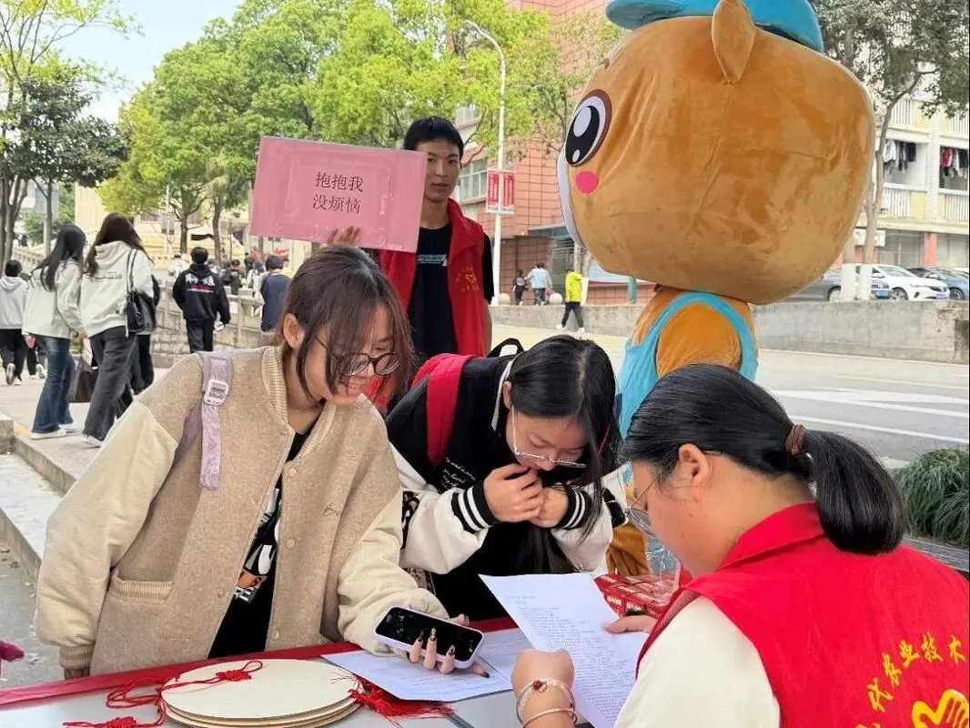 活动现场气氛热烈,形式多样的志愿服务项目吸引了大批师生驻足参与。在“雷锋精神知识竞答”区域,同学们踊跃答题,在互动中重温雷锋事迹、感悟榜样力量;“送抱抱”环节以温暖的方式传递善意,营造出温馨友爱的校园氛围;在绘画活动中,志愿者们带领同学们通过手工制作释放压力,体验心灵的宁静与愉悦。