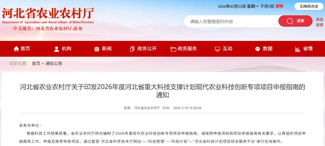 根据科技工作统筹部署,省农业农村厅研究编制了2026年度现代农业科技创新专项项目申报指南。请按照申报须知和项目申报指南有关要求,认真组织项目申报推荐工作。申报及推荐审核项目,通过登录“河北省科学技术厅网站”—“科技管理”—“科技计划”—“河北省科技计划项目综合服务平台”进行在线操作。