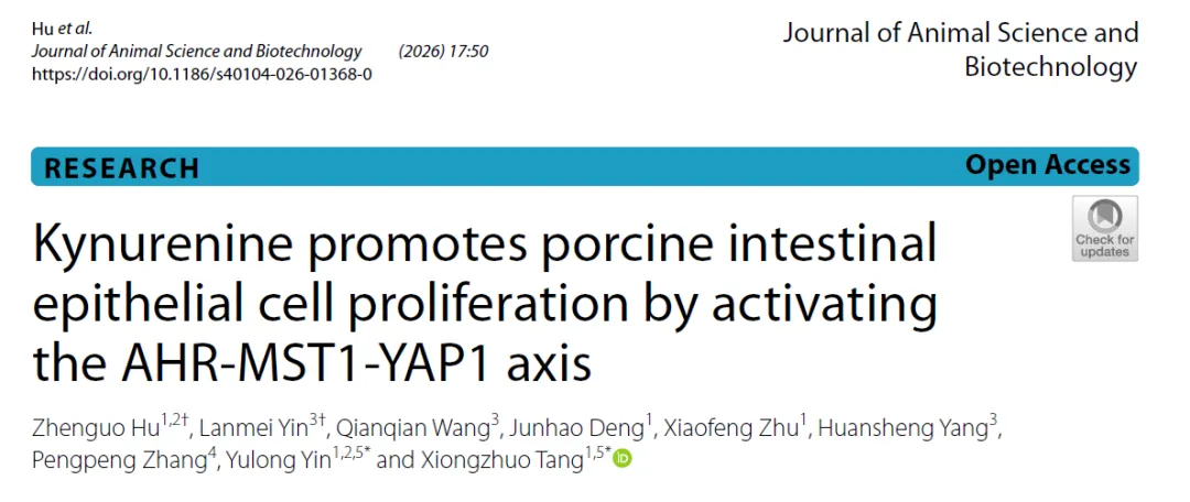 2026年3月,湖南农业大学唐雄卓教授团队在期刊《Journal of Animal Science and Biotechnology》(IF:6.5)在线发表题为:Kynurenine promotes porcine intestinal epithelial cell proliferation by activating the AHR-MST1-YAP1 axis 的高水平研究论文。