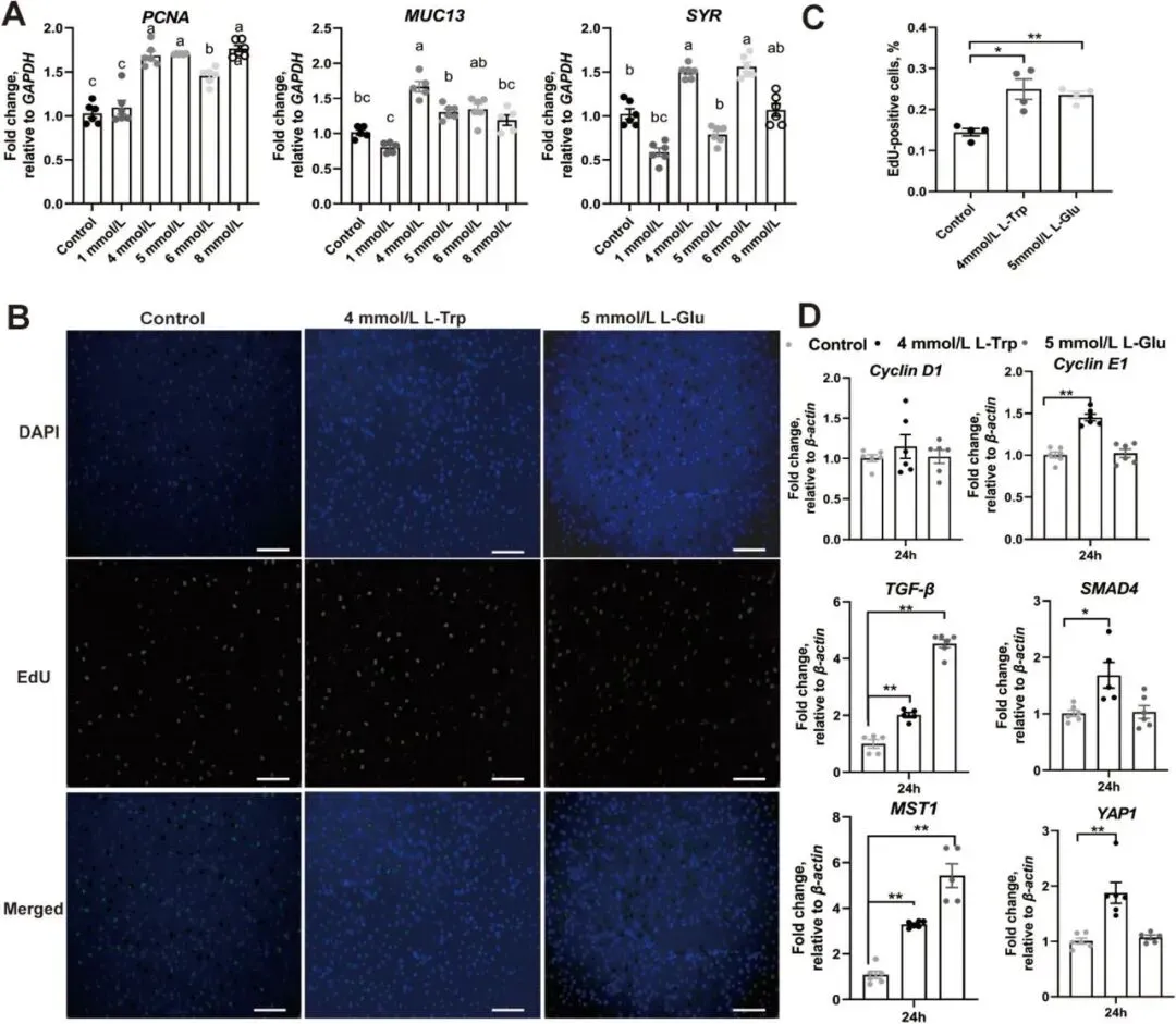 Figure 2验证了L-色氨酸对IPEC-J2细胞增殖的促进作用。实验发现4 mmol/L L-色氨酸处理可显著提高PCNA、MUC13和SYR的mRNA表达水平。EdU染色显示L-色氨酸处理组的EdU阳性细胞比例较对照组显著增加,且效果与5 mmol/L谷氨酸相当。进一步检测发现,L-色氨酸处理可上调细胞周期基因Cyclin E1、Cyclin D1以及TGF-β/SMAD4和MST1/YAP1信号通路相关基因的表达,表明L-色氨酸通过激活MST1-YAP1通路促进猪肠道上皮细胞增殖。