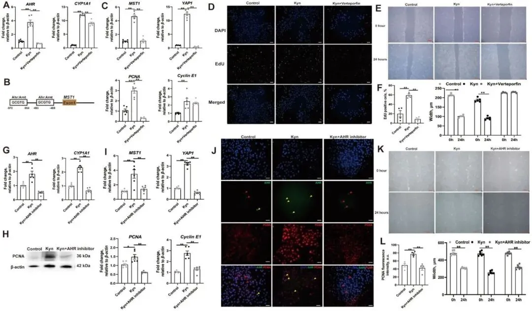Figure 5证实了AHR-MST1-YAP1轴在犬尿氨酸诱导细胞增殖中的必需性。犬尿氨酸处理显著上调AHR及其靶基因CYP1A1的表达,JASPAR数据库分析发现MST1启动子区存在两个保守的AHR结合基序。YAP1抑制剂Verteporfin共处理可阻断犬尿氨酸诱导的MST1、YAP1、PCNA和Cyclin E1表达上调,并抑制EdU掺入和细胞迁移。AHR抑制剂CH-223191同样可拮抗犬尿氨酸诱导的AHR核转位、PCNA表达及细胞迁移,证明犬尿氨酸通过AHR-MST1-YAP1轴促进IPEC-J2细胞增殖。
