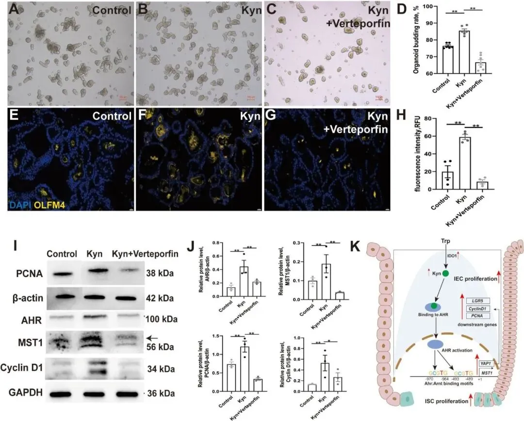 Figure 7验证了MST1-YAP1通路在犬尿氨酸诱导肠道干细胞增殖中的关键作用。YAP1抑制剂Verteporfin显著抑制犬尿氨酸促进的类器官出芽效率,并降低肠道干细胞标志物OLFM4的荧光强度。Western blot结果显示,犬尿氨酸处理上调AHR、MST1、PCNA和Cyclin D1蛋白表达,而Verteporfin共处理可阻断这些效应。该图最后提出工作模型:色氨酸经IDO1代谢为犬尿氨酸,犬尿氨酸结合并激活AHR,进而转录激活MST1,通过MST1-YAP1轴促进肠道上皮细胞和干细胞增殖。