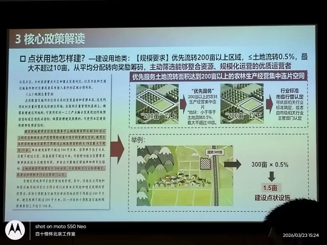 研讨会上,您及团队围绕三大核心文件进行了系统解读,尤其针对2号文(点状配套设施用地管理)的政策迭代、用地类型、建设要求及审批流程等关键内容,进行了精准答疑。您详细说明的建设用地与非建设用地分类标准、流转农地规模与建设指标配比要求、存量用地认定流程等,直接回应了我们在项目用地规划中的核心关切;您分享的简化审批流程、区级市级审批权限划分等政策要点,为我们避开了潜在的流程障碍,极大降低了项目时间成本。您的专业解读既立足政策文本,又结合实际案例,让我们对项目如何契合规划要求、高效推进审批有了清晰认知。