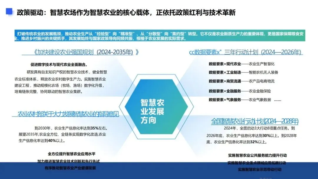 顶层设计持续完善,明确发展目标。《全国智慧农业行动计划(2024—2028年)》作为核心政策,划定了清晰的阶段目标:2026年底农业生产信息化率要达30%以上,2028年底提升至32%以上,2030年突破35%,2035年更是剑指40%的目标,同时提出要推动国产化智慧农业技术装备广泛应用,为智慧农场建设设定了明确的量化标准。2026年中央农村工作会议进一步锚定农业新质生产力,将智能装备研发、数字化改造列为智慧农业三大发力点,明确支持丘陵山区推进农机、农艺与品种的深度融合,兼顾不同区域的发展差异。
