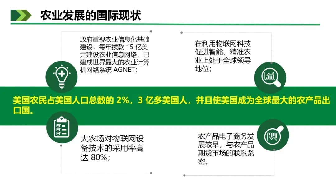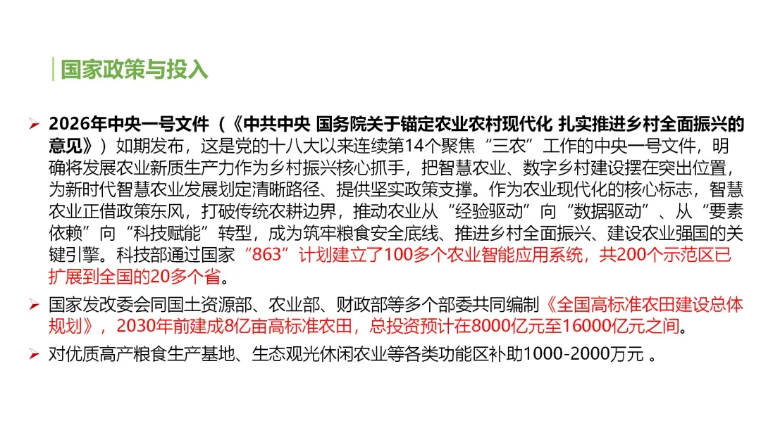 从国家战略需求来看,智慧农场是保障粮食安全的重要支撑。粮食安全是国之大者,随着人口增长与消费升级,对农产品产量和质量的要求不断提高。智慧农场通过数字化、智能化技术提升农业全要素生产率,推动主要作物单产提升,助力实现“藏粮于地、藏粮于技”的战略目标;同时,通过全产业链数字化管控,实现农产品质量可追溯,保障农产品安全,满足人民群众对高品质农产品的需求。