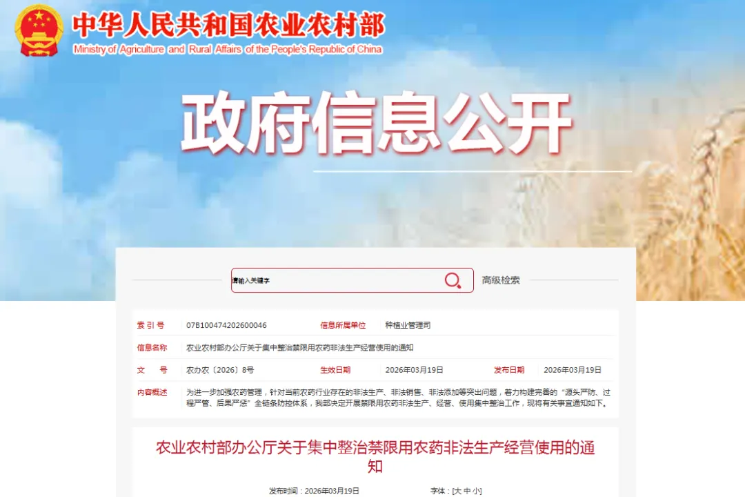 (全文)农业农村部发布集中整治禁限用农药非法生产经营使用的通知
