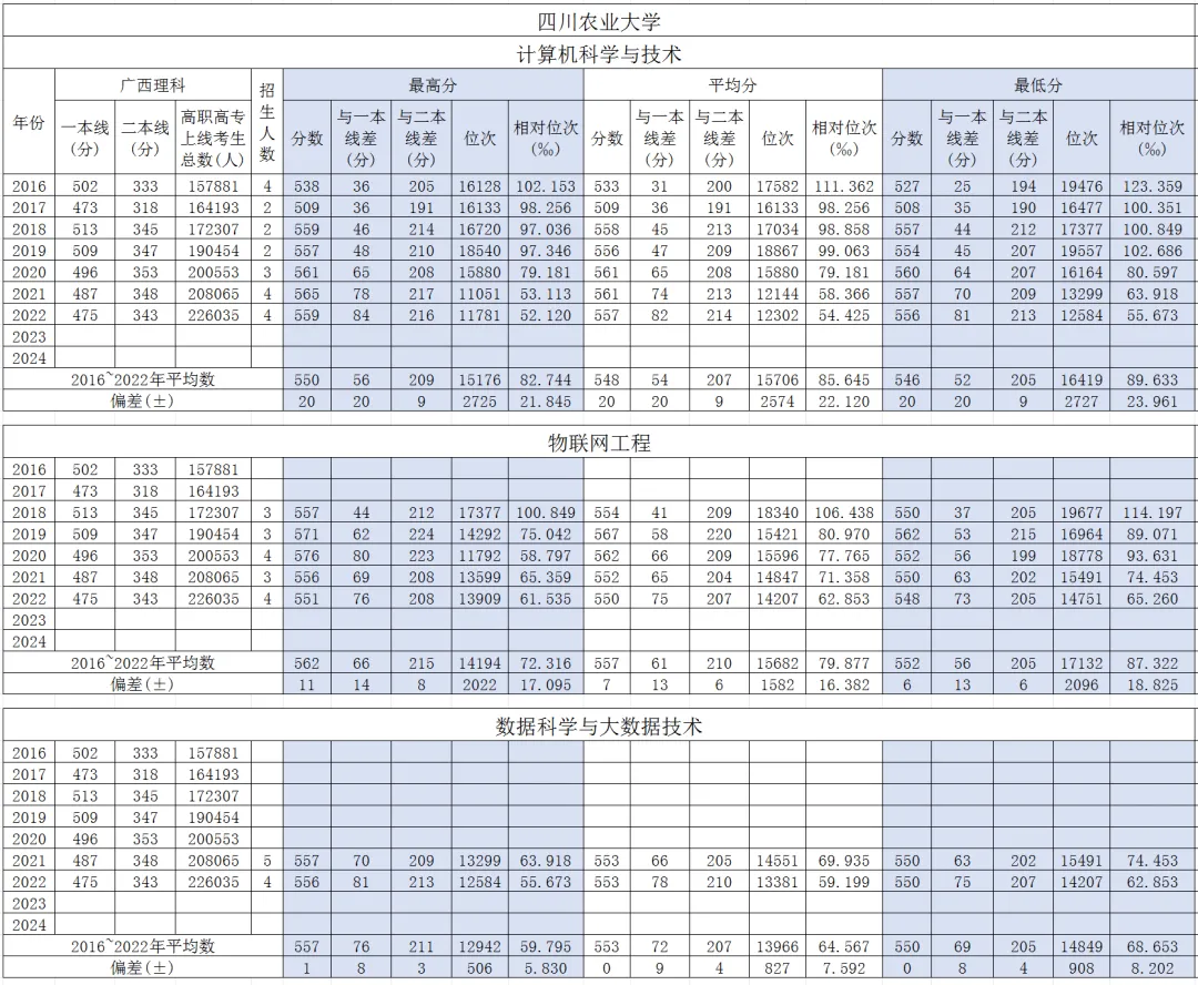 该校在广西考区2016~2022年的计算机科学与技术(或计算机类)本科专业的录取分数如图所示。2016~2022年招生专业为:计算机科学与技术,2018~2022年物联网工程,2021~2022年数据科学与大数据技术。相对位次=位次/理科高职高专上线考生总人数,历年录取分数、位次、相对位次的平均数及偏差(历年分数、位次、相对位次与平均数的离散程度)如下:
