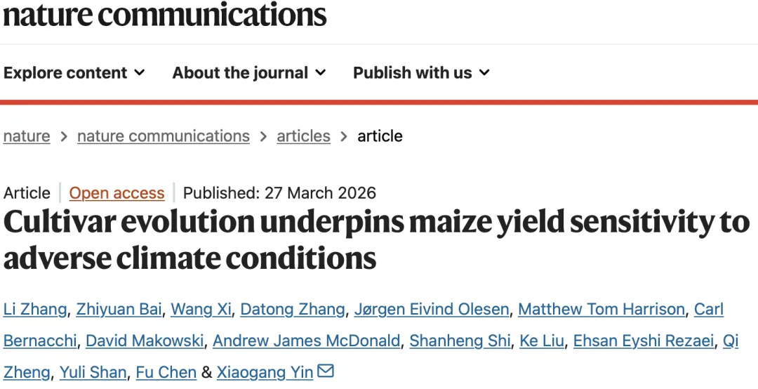 该研究基于 2001—2020 年中国四大玉米主产区 48797 条品种—站点—年份观测数据,系统解析品种演化对玉米产量增益及气候敏感性的调控作用。结果明确,品种演化是长期产量提升的核心驱动力,同时导致不同区域玉米对高温、降水胁迫的敏感性呈现显著分异特征,为气候韧性玉米育种提供关键科学依据。
