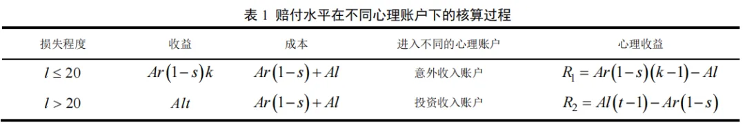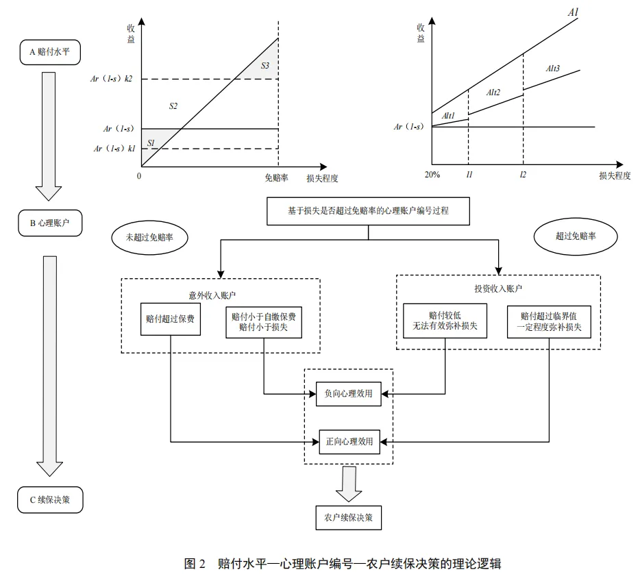 心理账户理论指出,当人们将不同收入进行心理账户的分析和比较时,心理满足的最大化是成为指导人们行为决策的基础,而非效用最大化。因此,综合考虑农户参保的心理成本和心理收益,以及二者在不同损失条件下的差异,是分析农户续保决策的关键。首先,当参保农户的心理收益大于或等于心理成本时,农户会对农业保险产生正向的心理效用,进而促进其续保行为的发生。反之,当参保农户的心理收益小于心理成本时,农户会对农业保险产生负向的心理效用,进而抑制其续保行为的发生。其次,不同损失条件下,参保农户的心理成本及其对保险赔付的预期存在差异。因此,需要结合损失程度进一步剖析农业保险赔付水平对农户续保行为的影响机理。参考洪甘霖等的理论分析框架,按照农业保险相对免赔率的要求,构建不同损失条件下参保农户的心理账户及其影响农户续保决策的核算过程和逻辑链条分别如表1和图2所示。其中,农业保险单位面积保额为A,保险费率为r,保费补贴率为s,损失程度为l,赔付比例为t。
