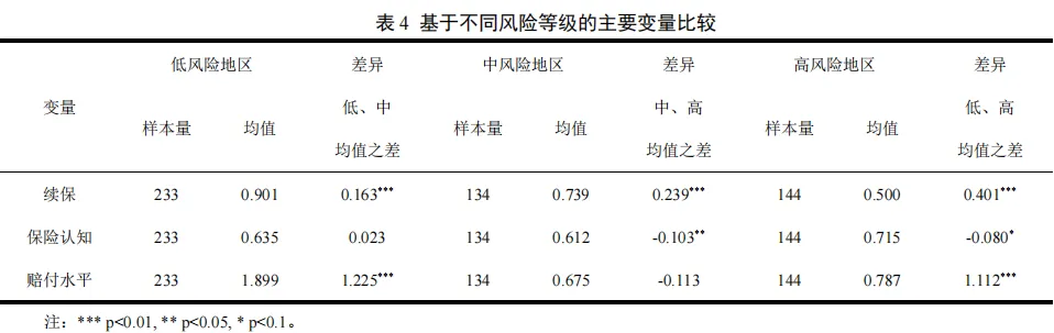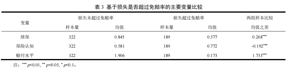 当损失超过免赔率时,农户的续保行为会因其对保险的预期和定位而有所不同。如果农户将农业保险视为风险管理工具,会认为尽管农业保险无法完全弥补所有损失,但它可以提供一定的安全网,帮助其减轻农业风险带来的负担,保障其基本农业生产利益,农户还是会做出下一期续保行为。如果农户将农业保险视为一种政府补贴或转移支付的手段,而忽视了其作为风险管理工具的重要性。这种认知偏差可能导致他们在面对低赔付水平时,更倾向于放弃续保,而不是将其作为降低农业生产风险的有效方式。据此,提出第三个研究假说: