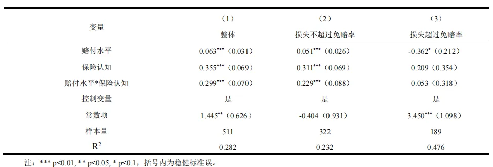 当损失未超过免赔率时,农户凭借丰富的经验和风险洞察,对潜在风险持规避态度。此时,将农业保险视为风险管理工具的农户更倾向于续保,保险赔付在他们看来可以为下一期农业生产保驾护航。反观将农业保险视为政府补贴或转移支付的渠道之一的农户,他们对有限的补贴化理赔能够分散未来农业生产风险并不抱有希望。同时,相较于未遭受损失的农业产出而言,有限的转移支付显得微不足道,几乎无法弥补潜在的收益损失。因此,转移支付工具的保险认知对农户续保行为的促进作用可能并不明显。