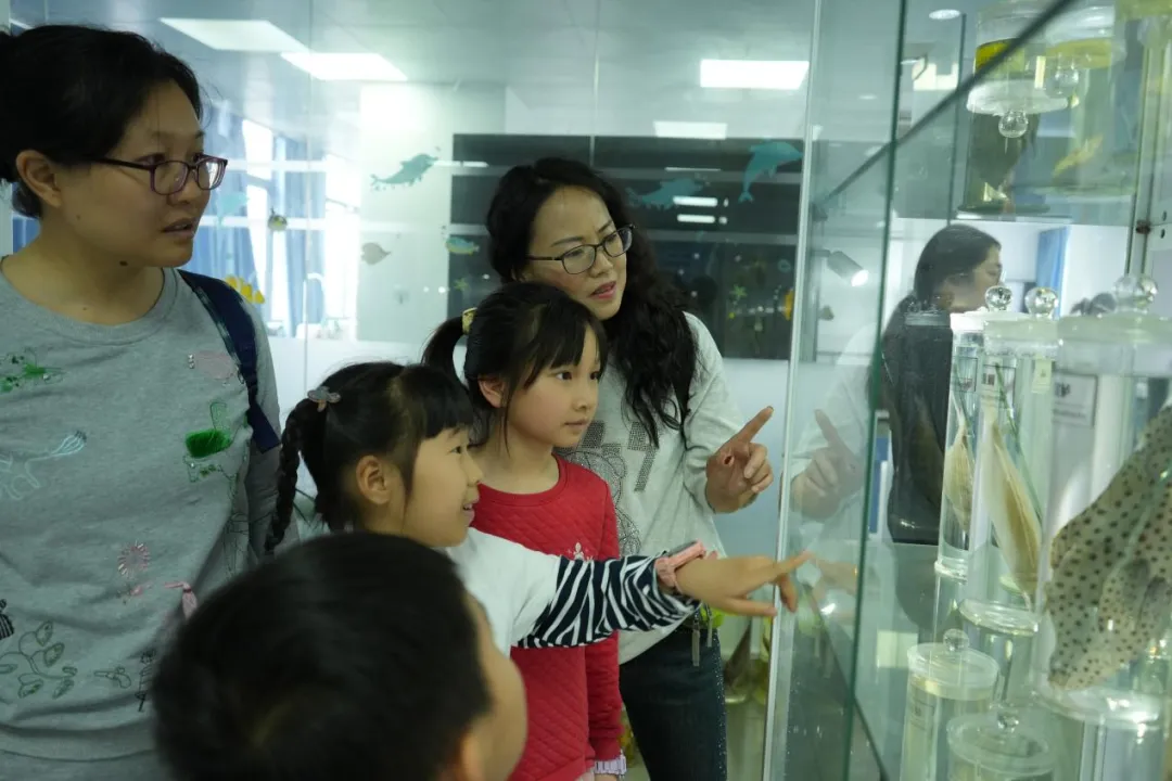 活动伊始,海洋与渔业学院团委张哲颖老师带领小朋友与家长走进校史馆,追溯学校办学历程,感受深厚办学底蕴,深入了解海洋与渔业专业发展历程,感受专业特色与文化魅力。随后,大家移步海洋生物标本室,近距离观赏形态各异的海洋生物标本,直观领略海洋生物的多样性与自然之美。