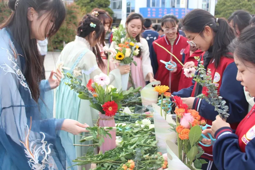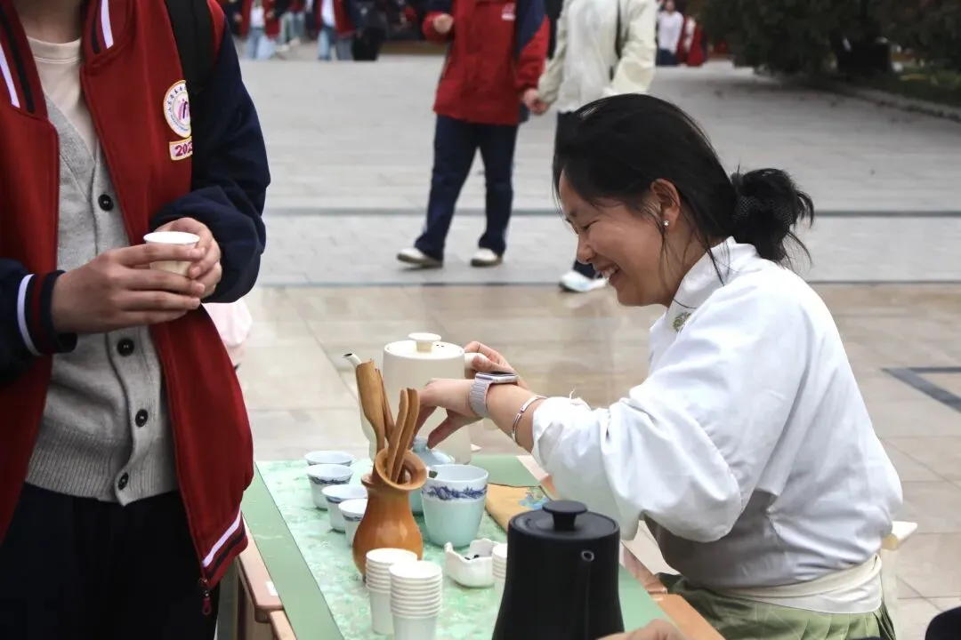茶文化社团带来沉浸式国风美育体验,带队同学身着典雅汉服,衣袂翩跹。茶文化社团带队同学温杯烫盏,讲解茶礼茶识与基础茶知识,示范泡茶流程,引导一中的同学们动手实操;插花体验过程中,向高中学子们现场讲解花艺基础知识与花材常识,指导大家亲手创作花艺作品。让泰安一中的同学们在识茶、泡茶、品茶与花艺创作中,感受传统美学与生活艺术之美,提升审美与动手能力。