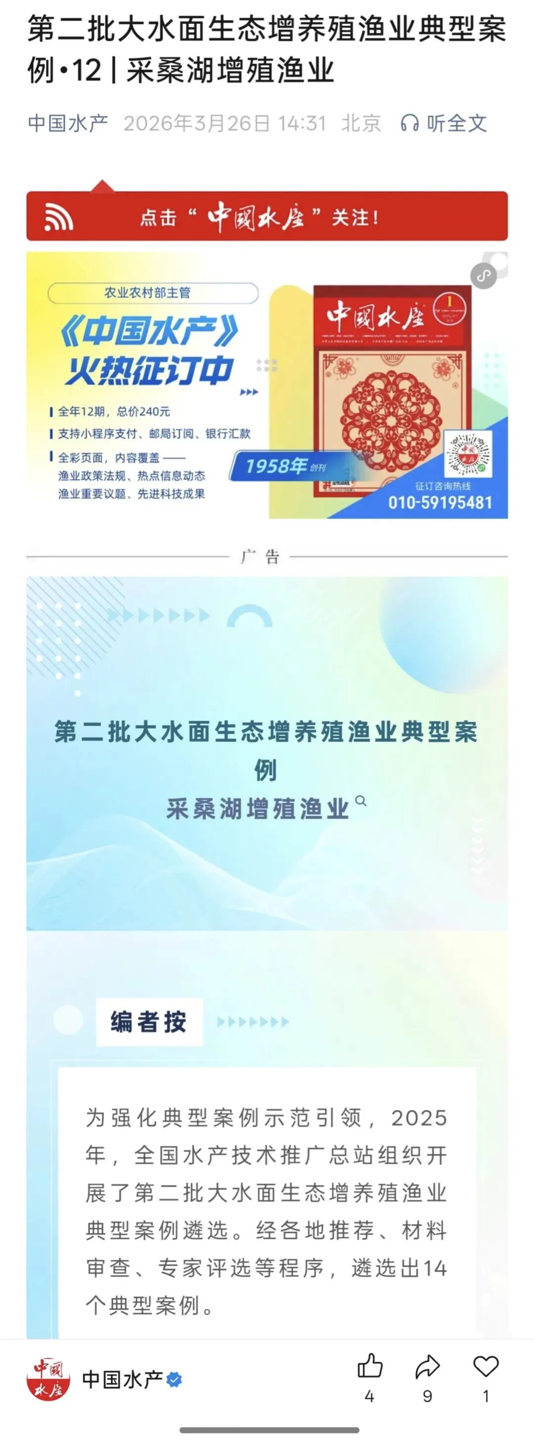 【中国水产推介】第二批大水面生态增养殖渔业典型案例•12 | 采桑湖增殖