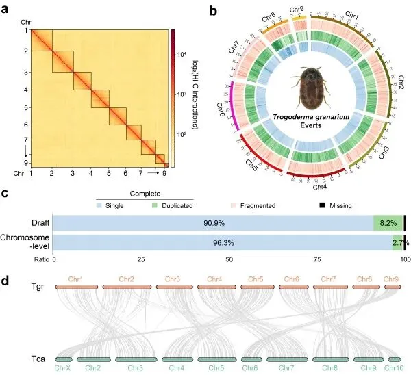 该研究首次组装了谷斑皮蠹的染色体水平基因组,总长327 Mb,scaffold N50达38 Mb,其中93.97%的序列锚定至9条染色体(图2a-b),99.0%的BUSCO完整度验证了其完整性(图2c)。基因组注释共鉴定到19,112个蛋白编码基因。比较基因组分析揭示,谷斑皮蠹的第9号染色体与赤拟谷盗的X染色体具有高度共线性(图2d)。