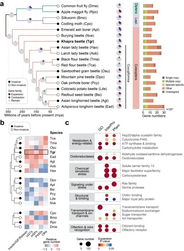 为解析谷斑皮蠹的环境适应机制,该研究对包括10种入侵昆虫在内的18个物种进行了比较基因组分析(图3a)。基因家族进化分析表明,谷斑皮蠹基因组中显著扩张的家族主要富集于三大功能类群:一是与生长发育密切相关的胰岛素/IGF/松弛素(Insulin/IGF/Relaxin)家族;二是涉及解毒代谢的P450s和UDP-葡萄糖醛酸转移酶;三是参与胁迫应答的热激蛋白HSP20/α-crystallin、信号传导相关的Ras及丝氨酸蛋白酶等(图3b-c)。此外,跨膜转运蛋白及化学感受相关基因家族也呈现扩张趋势。这些扩张的基因家族共同构成了谷斑皮蠹耐受极端环境、定殖新生境的基因组基础。