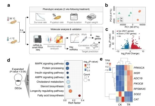 图4 谷斑皮蠹耐寒机制的转录组分析。a 研究方法示意图;b 低温处理组(TR)与对照组(CK)样本的主成分分析;c 差异表达基因(DEGs)火山图(|log2FoldChange|>1,padj<0.05);d 显著扩张基因家族(p<0.05)与差异表达基因(padj<0.01,q<0.01)重叠基因的KEGG通路富集分析;e 参与寿命调节通路的差异表达基因热图。