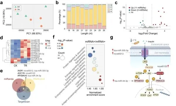 图6 谷斑皮蠹耐寒性的潜在miRNA调控网络。 a 低温胁迫(TR)与对照(CK)条件下miRNA图谱的主成分分析;b 已知miRNA与 novel miRNA在不同序列长度下的首位核苷酸偏好性分布;c 差异表达miRNA(DEMs)火山图(|log2FoldChange|>1,padj<0.05);d 显著差异表达miRNA的分层聚类热图;e 基于miRanda、RNAhybrid与TargetScan预测寿命调节通路中miRNA靶标的韦恩图;f 上调差异表达miRNA及其靶基因的联合KEGG通路富集分析(padj<0.05,q<0.05)。g 低温胁迫下胰岛素信号与寿命通路潜在调控网络示意图;经RNAi验证对低温存活或发育有显著影响的基因以红色标注(红框:ADCY9;红色字体:INSR, PIK3CB);虚线箭头表示预测的miRNA-靶基因互作关系。