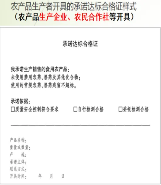 农产品质量安全承诺达标合格证(以下简称“承诺达标合格证”)是指农产品生产企业、农民专业合作社、农户和从事农产品收购的单位或者个人,根据质量安全控制、检测结果等依法开具,承诺其销售的农产品未使用禁用农药、兽药及其他化合物且使用的常规农药、兽药残留不超标等的证明。