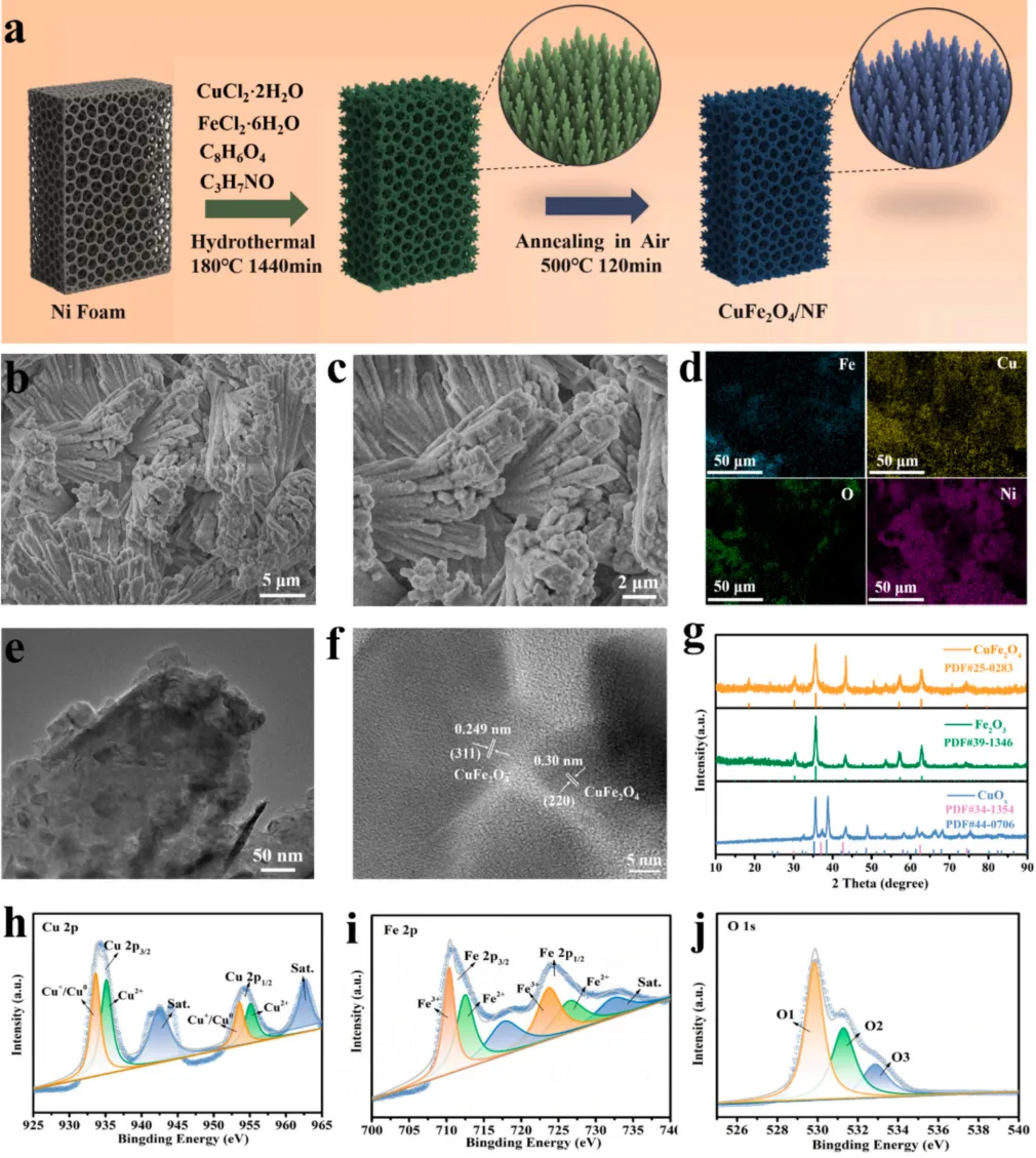这组图首先展示了珊瑚状 CuFe₂O₄/NF 催化剂的合成思路:采用水热反应结合高温煅烧,在泡沫镍基底上原位生长出规整的纳米阵列。SEM 图像直观呈现出催化剂独特的珊瑚状三维形貌,结构疏松有序,能大幅暴露活性位点并提升传质效率;EDX 元素 mapping 显示 Cu、Fe、O、Ni 四种元素均匀分布,证明材料组分均一;HRTEM 清晰标定了 CuFe₂O₄的(311)、(220)晶面,XRD 图谱与标准尖晶石结构卡片完全匹配;XPS 精细谱则精准分析了 Cu、Fe 的价态与表面氧空位、晶格氧信息,全套表征共同证实尖晶石型 CuFe₂O₄催化剂被成功制备。