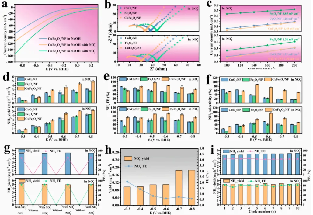 该图是最关键的性能数据展示,直接证明催化剂的优异表现。LSV 曲线显示,加入硝酸根 / 亚硝酸根后电流显著提升,且 CuFe₂O₄/NF 的起始电位更正、电流更大,活性优于单金属氧化物;EIS 与 ECSA 测试表明,该催化剂拥有最小的电荷转移电阻和最大的电化学活性面积,反应动力学更快。在核心指标上,-0.8 V 时氨产率分别达到4.97、5.25 mg h⁻¹ cm⁻²,法拉第效率最高接近 97%,选择性超 95%;副产物亚硝酸根、水合肼产量极低,10 次循环后性能几乎无衰减,交替对照实验证实氨完全来自硝酸根 / 亚硝酸根转化,全面体现出高活性、高选择性、高稳定性。