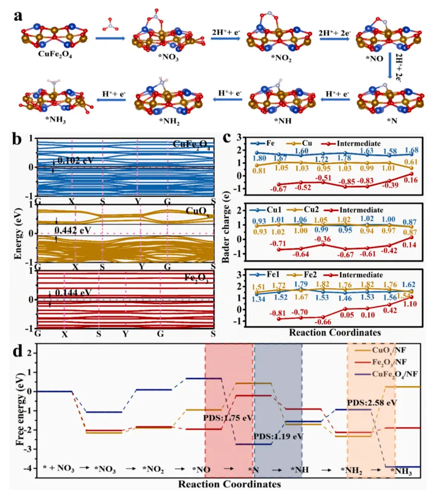 该图从理论层面揭示高性能的内在原因:研究确定了 CuFe₂O₄上最有利的硝酸根还原制氨反应路径;能带计算显示,CuFe₂O₄的带隙远小于 Fe₂O₃和 CuOₓ,导电性更优;吉布斯自由能图清晰表明,单金属催化剂存在极高的反应能垒,而 CuFe₂O₄显著降低了决速步的能量壁垒;Bader 电荷计算则定量展示了活性位点与中间体间的电子转移强度,从理论角度证明Cu–Fe 双原子协同是提升催化动力学的核心。