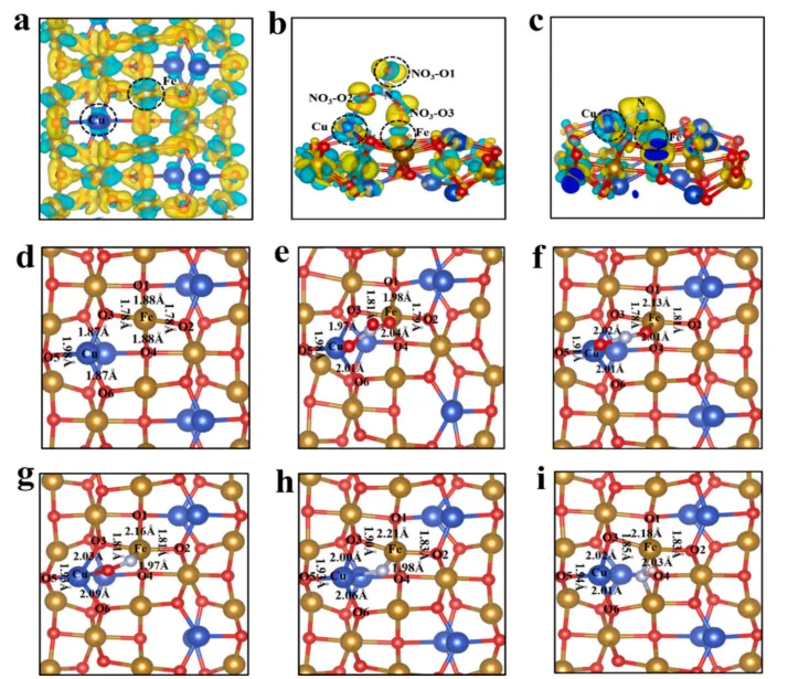 如图,电荷密度差图显示,Fe 和 Cu 位点发生电子消耗,利于吸附带负电的硝酸根,吸附后出现明显的界面电荷转移;在硝酸根逐步脱氧、加氢的反应过程中,Fe–O 键比 Cu–O 键发生更显著的键长变化,说明Fe 主导中间体吸附与结构调控;在决速步 * N→NH 中,中间体富集负电荷,大幅降低加氢能垒;最后一步 Cu 获得电子,促使NH₃脱附生成氨气,完整阐明了电子调控+结构协同的双机制催化原理。