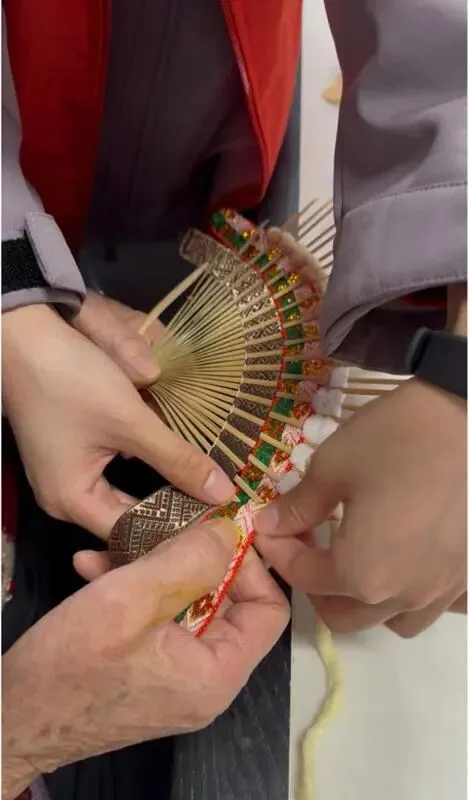 活动现场,志愿者们首先向老人们介绍了壮锦这一国家级非物质文化遗产的历史渊源与艺术特色,并带领老人们亲手制作壮锦扇。