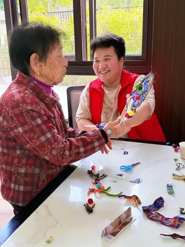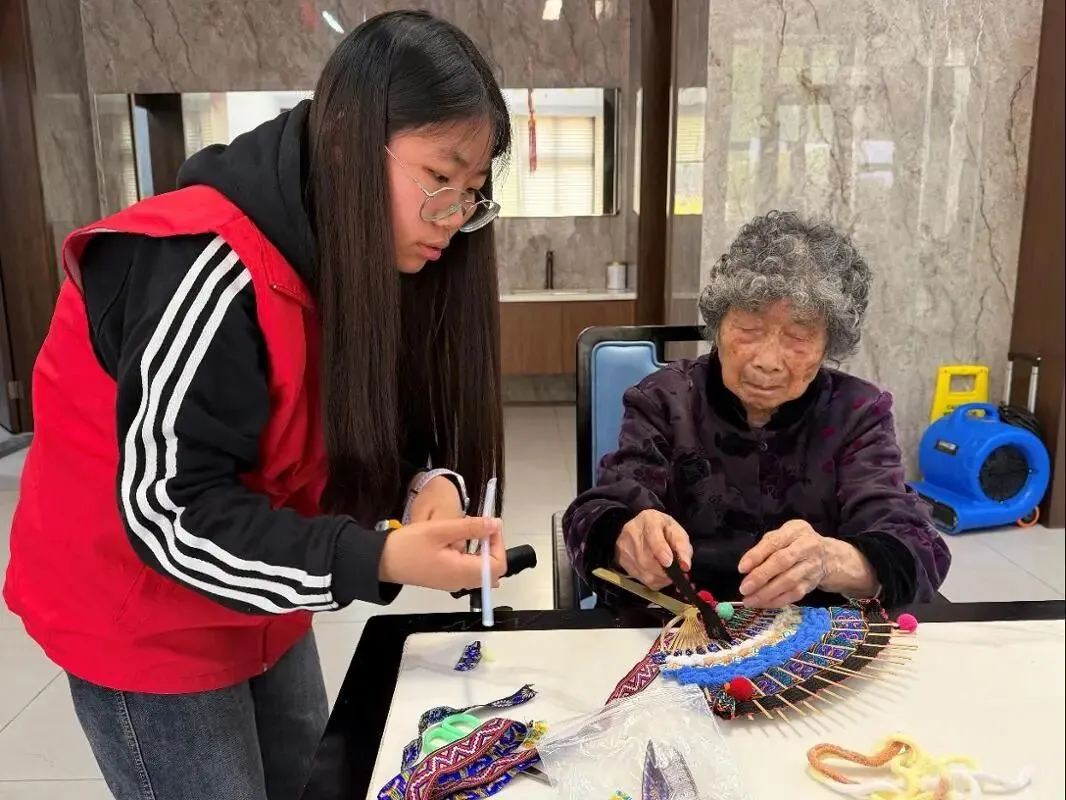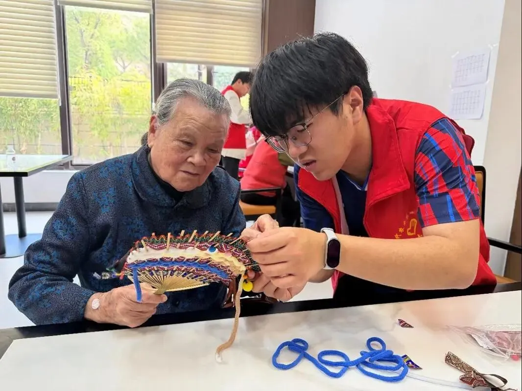 “奶奶,您看这个花纹这样搭配好不好看?”“爷爷,我来帮您固定一下扇面。”在志愿者的耐心引导下,老人家们兴致勃勃地挑选图案、搭配色彩、粘贴装饰。老人们做起手工来一丝不苟,现场欢声笑语不断。一幅幅独具匠心的壮锦扇在指尖诞生,老人们手捧作品,脸上洋溢着自豪与喜悦。一位奶奶感慨道:“跟这些年轻人在一起,感觉自己都变年轻了。”