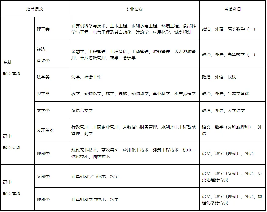 二、招生专业、层次及考试科目