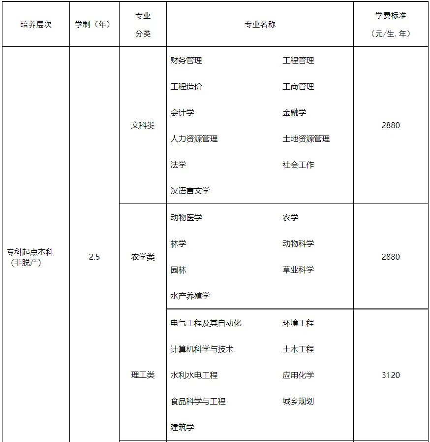 (二)缴费方式1.学费分年收取,首次缴费于报到前完清。专科起点本科、高中起点专科各专业学费按2.5年收取,高中起点本科各专业按5年收取。2.学费由学生通过四川农业大学官方在线缴费平台自行缴纳。