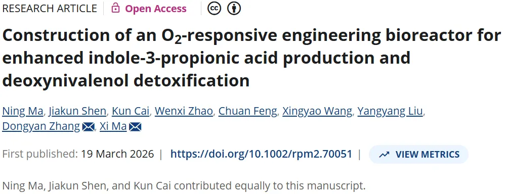 近日,中国农业大学马曦教授与北京市农林科学院畜牧兽医研究所张董燕副研究员等在Responsive Materials期刊上发表题为《Construction of an O2-responsive engineering bioreactor for enhanced indole-3-propionic acid production and deoxynivalenol detoxification》的研究论文。本文开发了一种氧气响应型的生物反应器,用于高效生产生物活性代谢物3-吲哚丙酸(Indole-3-propionic acid, IPA),并验证其在缓解脱氧雪腐镰刀菌烯醇(Deoxynivalenol, DON)诱导的畜牧动物肠道损伤方面的保护效果。