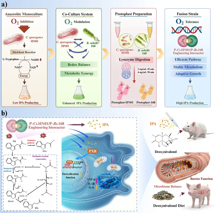 本文创新性构建出一种氧气响应型生物反应器。通过好氧-厌氧代谢耦合与种间原生质体融合技术,将枯草芽孢杆菌的氧气耐受特性整合入产孢梭菌,从而创制出P-Cs.HN01/P-Bs.168融合菌株。此工程菌株能在有氧条件下实现3-吲哚丙酸(IPA)稳定、高产的生物合成。所产的IPA在畜牧动物模型中,有效缓解了脱氧雪腐镰刀菌烯醇(DON)诱导的肠道氧化应激、炎症和屏障损伤,为开发用于厌氧生物制造和生物医学应用的响应型活体材料提供了新型通用策略。