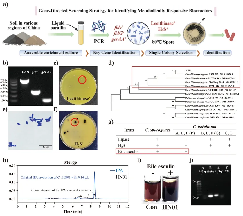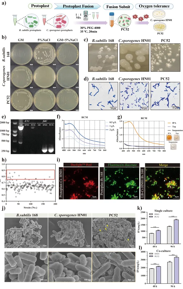 该研究采用了 “两步法”策略。第一步是好氧-厌氧代谢耦合:首先筛选到一株高产IPA的厌氧产孢梭菌(Cs.HN01),并发现与一株好氧的枯草芽孢杆菌(Bs.168)共培养时,后者能消耗氧气,为前者创造局部厌氧微环境,从而显著提升IPA产量。这证明通过微生物互作将氧气“转化”为生产刺激的可行性。第二步采用种间原生质体融合技术,将这种依赖共培养的、临时性的互作优势永久固定下来。将枯草芽孢杆菌的氧气耐受/消耗相关特性与产孢梭菌的IPA合成能力整合进一个单一的工程菌株中。