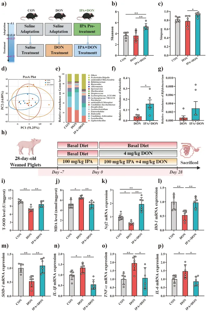 研究进一步在体内验证了该生物反应器所产IPA的生物活性。在脱氧雪腐镰刀菌烯醇(Deoxynivalenol, DON,一种常见的霉菌毒素)诱导的小鼠和仔猪肠道损伤模型中,IPA处理显示出全面的保护作用:它能缓解肠道氧化应激、增强肠道屏障完整性、抑制肠道炎症反应,并能有益调节肠道菌群结构(如增加Dubosiella和Bifidobacterium等有益菌的丰度)。这些结果证明了该工程系统的产物具有明确的生物医学应用潜力,尤其是在缓解霉菌毒素毒性方面。