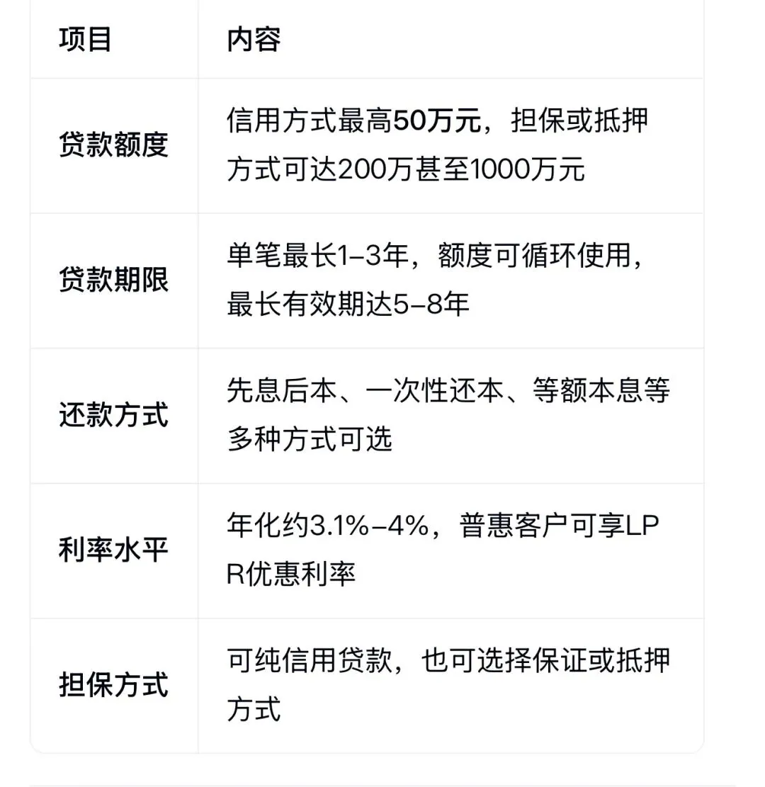 该产品依托大数据和金融科技手段,自动采集客户信息并核定授信额度,提供信用、抵押、保证等多种担保方式,满足不同用户的融资需求 。贷款额度起点为3000元,根据担保方式不同,最高可达1000万元 。贷款期限最长可达8年,适用于生产经营周转或消费用途 。