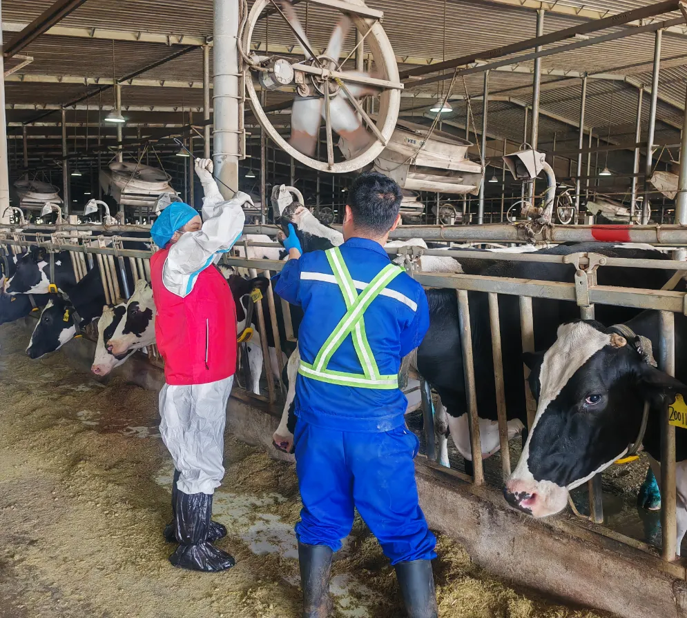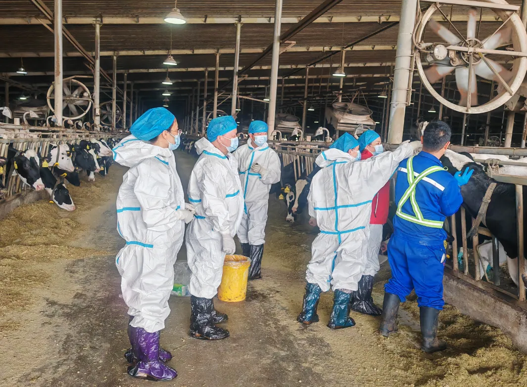 在基地现场,科技特派员团队与牧场技术人员深入交流,详细了解奶牛养殖管理、生物安全措施及既往监测情况并严格按照技术规范,现场演示并指导奶牛结核菌素皮内变态反应试验操作、布鲁氏菌病采血及实验室检测要点,就样品采集、保存、运输及个人防护等关键环节进行了细致讲解与实操带教。服务过程中,特派员累计完成近1500头奶牛的现场监测技术指导,帮助牧场进一步规范监测流程,提升自主检测与风险预警能力。