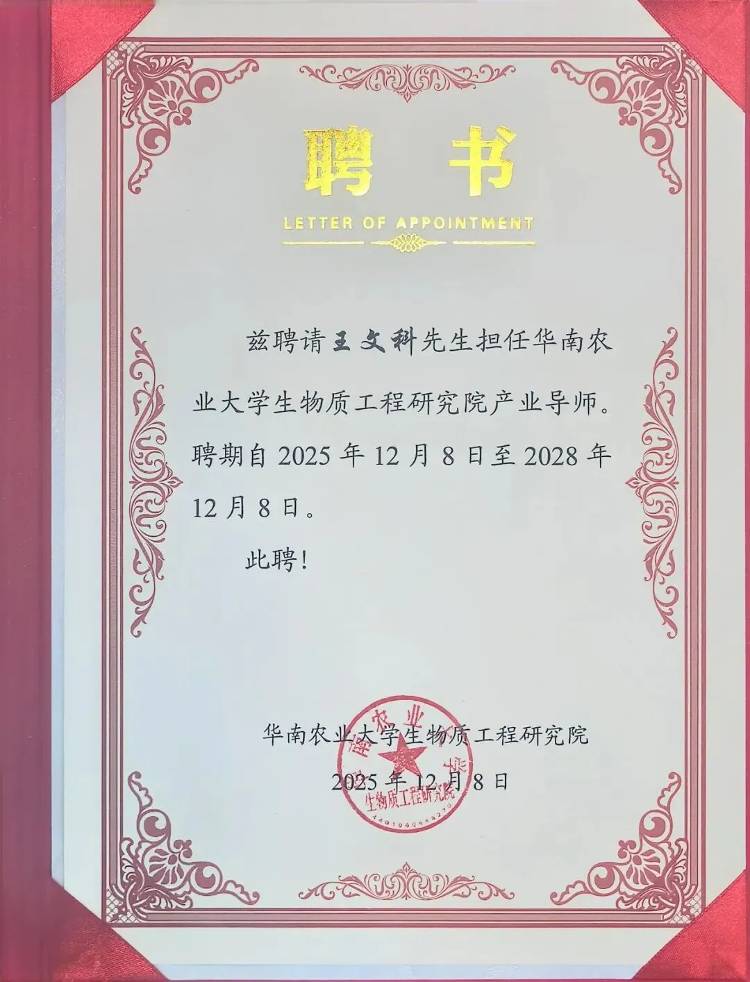 2025年12月8日,江科农业董事长王文科先生正式受聘为华南农业大学生物质工程研究院产业导师,聘任仪式圆满举办。