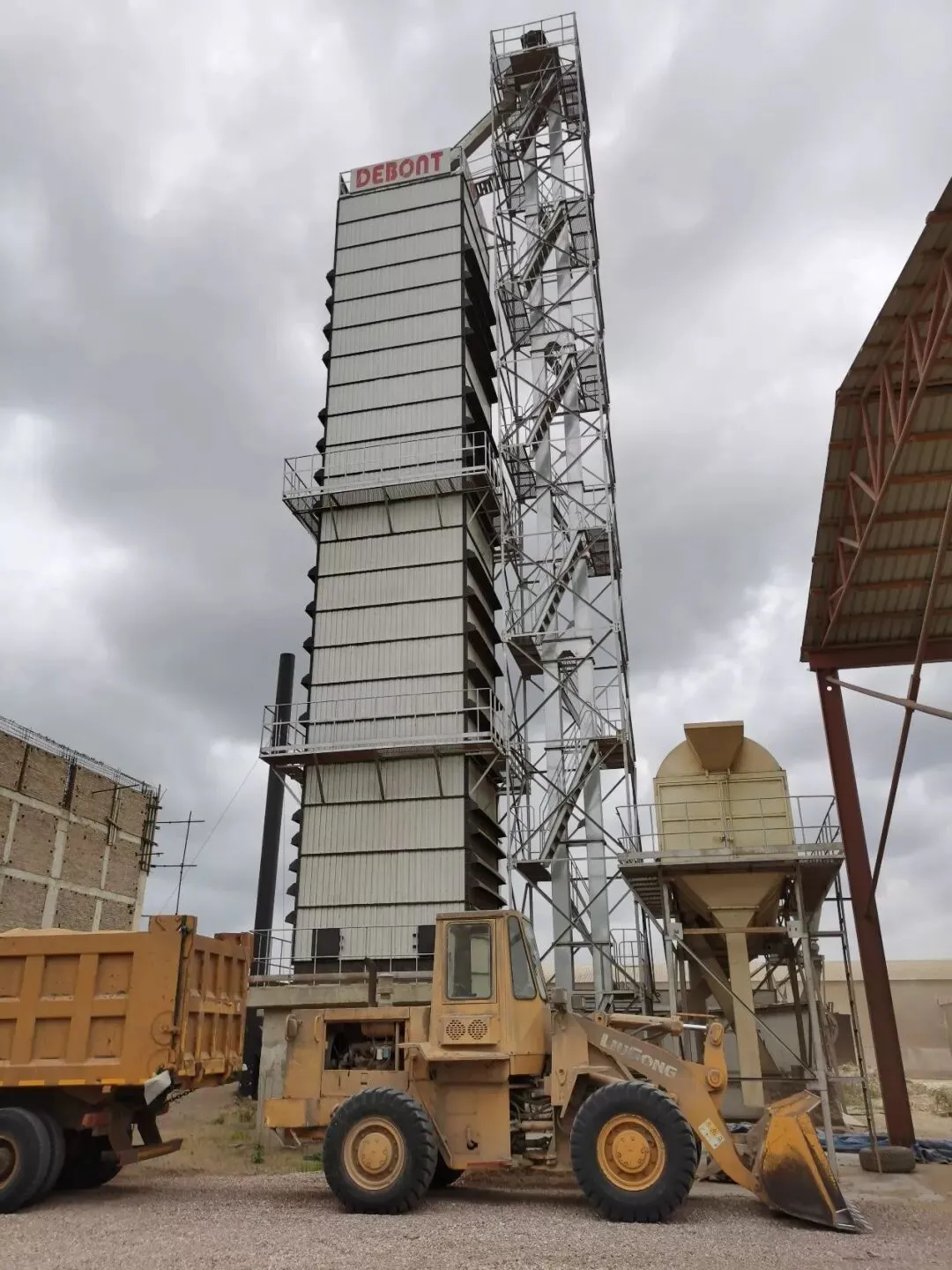 稻谷烘干塔,由于莫桑比克雨季潮湿,旱季寒冷,全年缺乏晾晒谷子的适宜天气,因此万宝项目专门从韩国进口了一座稻谷烘干塔
