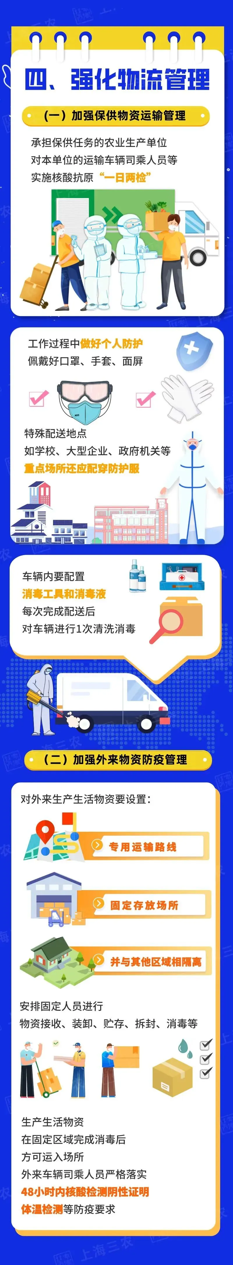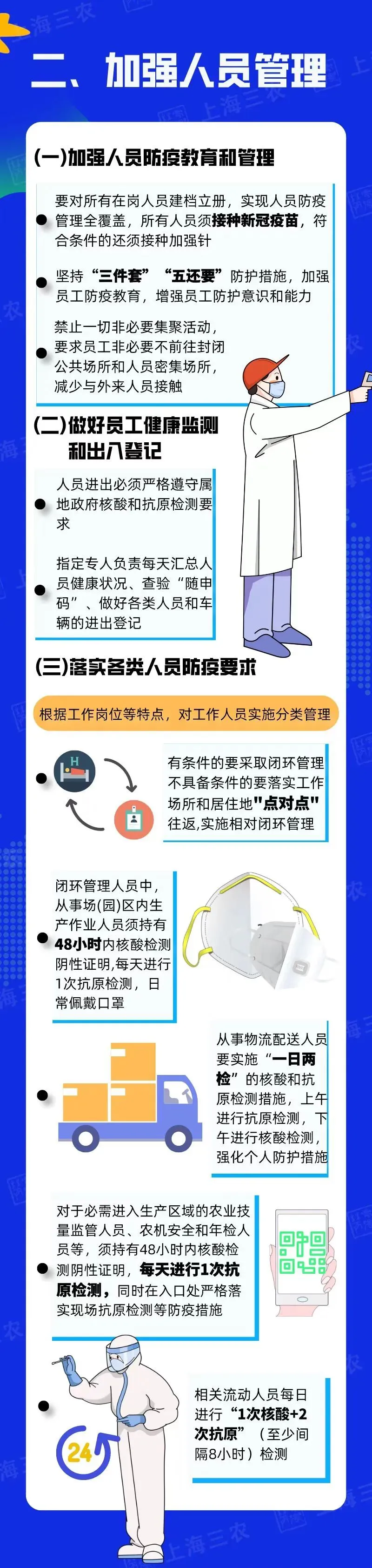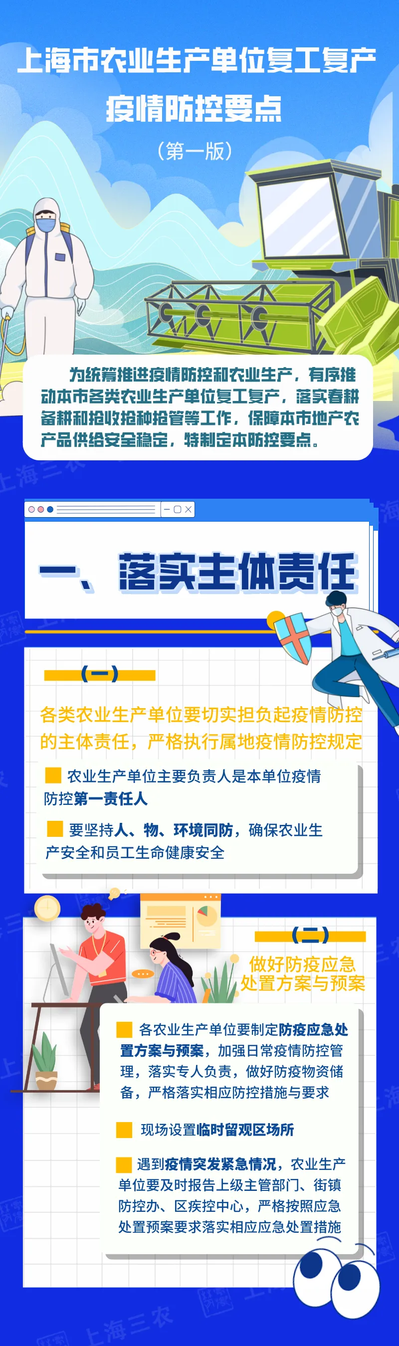 市农业农村委介绍,为统筹推进疫情防控和农业生产,有序推动本市各类农业生产单位复工复产,落实春耕备耕和抢收抢种抢管等工作,保障本市地产农产品供给安全稳定,特制定本防控要点,并由市防控办印发。内容包括落实主体责任、加强人员管理、严格场所管理、强化物流管理、压实属地责任等五方面。详见↓