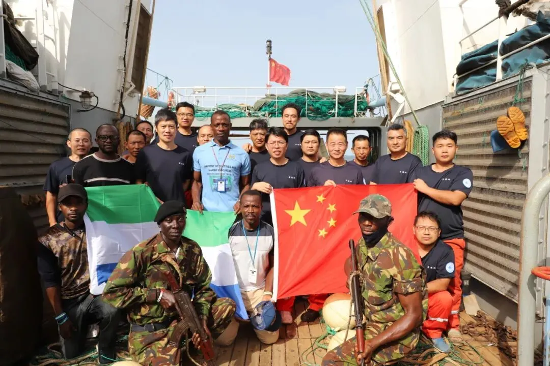 然而惊涛骇浪的考验远未结束。“队长,我船没动力了!”2021年6月5日晚9时许,“中渔科212”船在离岸近100海里的地方失去动力,无法航行!失动,意味着受风流影响有侧翻隐患,还可能发生碰撞、搁浅的不可控因素,此乃航行之大忌!漆黑海面,巨轮如断翼之鸟。冷汗瞬间浸透脊背,我立即向中水公司报告船位,请求就近船舶抵近救援。在向使馆和国内汇报相关情况后组织开展自救!“十五分钟后通话,专人值守电话,轮机长随时汇报!”一场跨越时区的紧急会诊旋即展开——中水、红洋、盛海等公司总轮机长与国内轮机人员远程集结,我们彻夜研判。时间分秒流逝,五小时后终于锁定故障点,船舶恢复最低限度动力。当“中渔科212”蹒跚驶入弗里敦港的晨光中,劫后余生的热泪模糊了我的双眼。